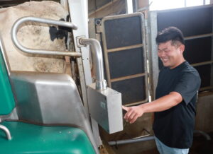 【2025年11月4週号】鹿屋市串良町の株式会社Tabata Milk Labo代表・田畑健志さん(32)は、両親の酪農経営を引き継ぎ2022年に法人化した。将来を見据え「少人数で経営を維持するには、搾乳時間を減らすしかない」と考え、23年から搾乳ロボットを活用している。